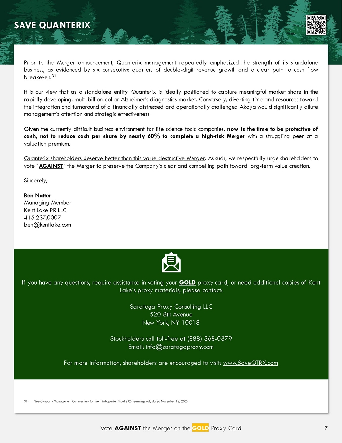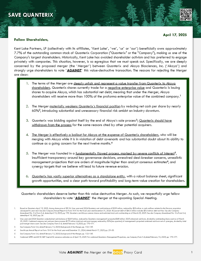 Kent Lake Partners LP (“Kent Lake Partners”) has filed a definitive proxy statement and accompanying GOLD proxy card with the Securities and Exchange Commission (“SEC”) to be used to solicit votes in connection with its opposition to proposals to be presented at a special meeting of stockholders (the “Special Meeting”) of Quanterix Corporation, a Delaware corporation (the “Company”), in connection with the Company’s agreement and plan of merger (the “Merger”) with Akoya Biosciences, Inc. Kent Lake Partners, together with the other Participants (as defined below), also intends to file a preliminary proxy statement and accompanying GOLD universal proxy card with the SEC to be used to solicit votes for, among other matters, the election of its slate of highly-qualified director nominees at the 2025 annual meeting of stockholders of the Company (the “Annual Meeting”).