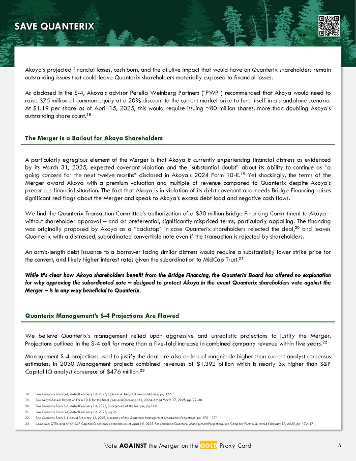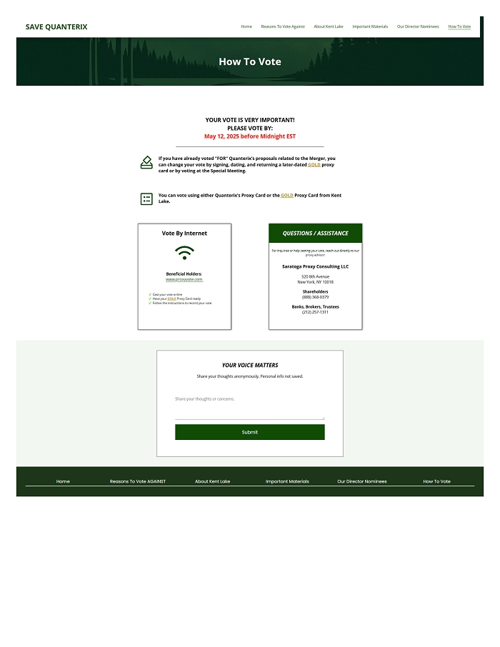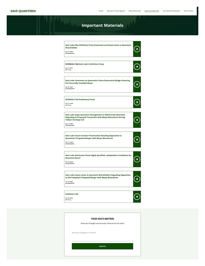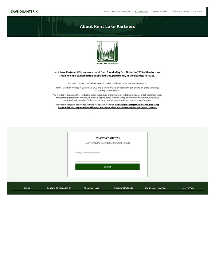 Item 2: On April 18, 2025, Kent Lake Partners uploaded the following materials to www.SaveQTRX.com: