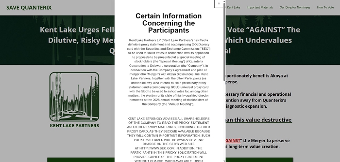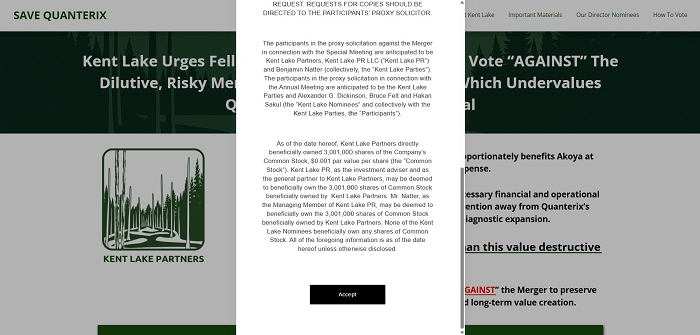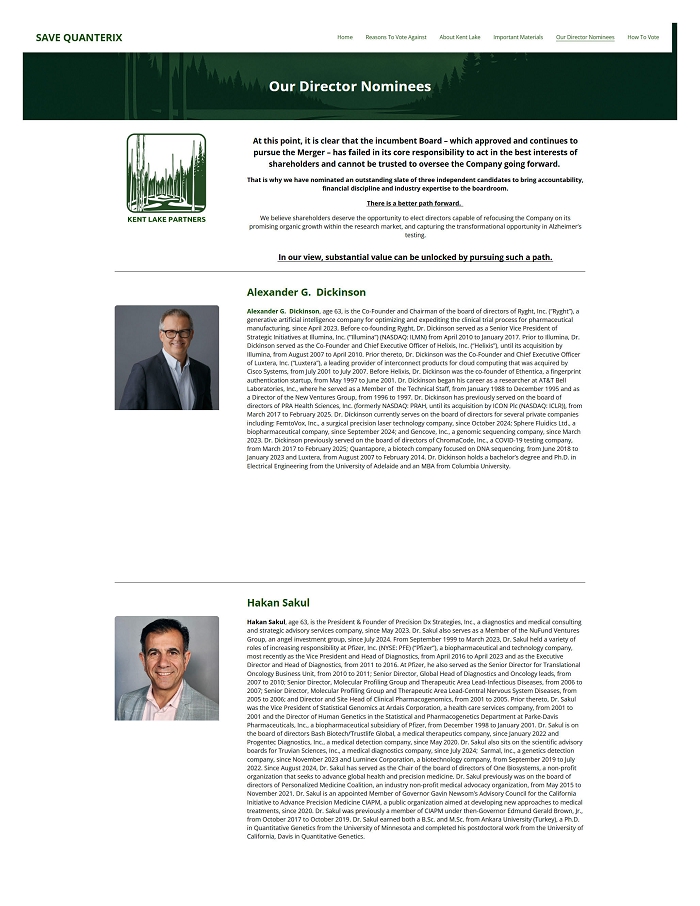Kent Lake Files Definitive Proxy Statement and Sends Letter to Quanterix Shareholders