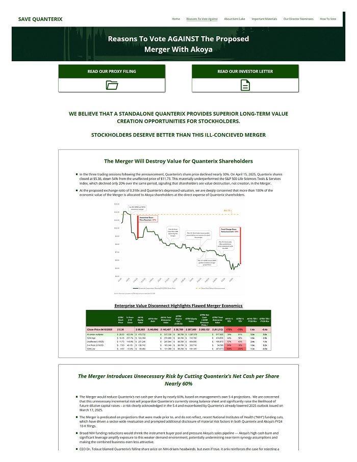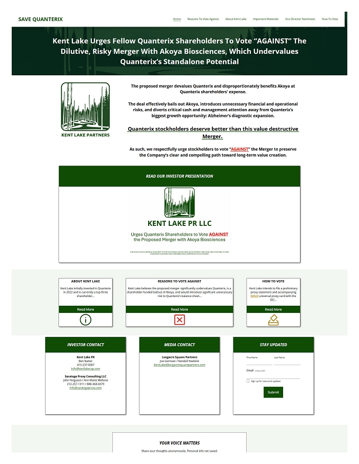 RINCON, Puerto Rico – (BUSINESS WIRE) – Kent Lake PR LLC (“Kent Lake”), a holder of approximately 7.7% of the outstanding common stock of Quanterix Corporation (“Quanterix” or the “Company”) (NASDAQ: QTRX), today announced that it has filed a definitive proxy statement with the U.S. Securities and Exchange Commission (the “SEC”) and sent a letter to its fellow Quanterix shareholders in connection with its opposition to the Company’s proposed merger (the “Merger”) with Akoya Biosciences (“Akoya”) (NASDAQ: AKYA).